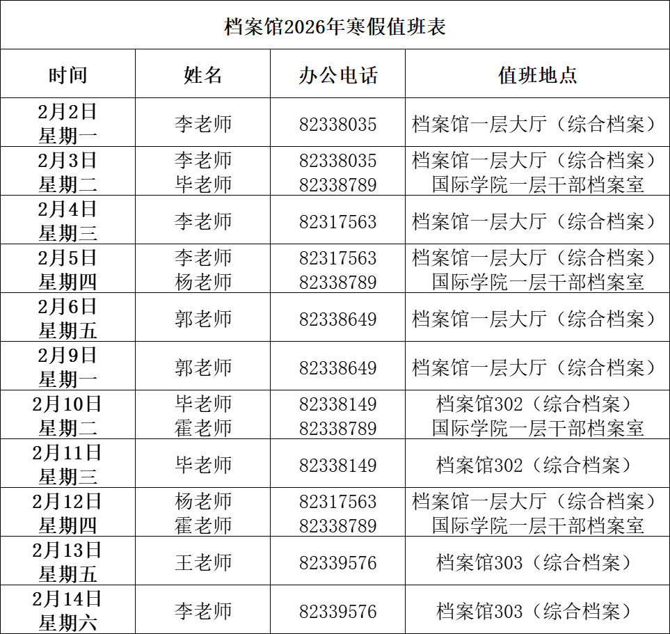 根据学校《关于2026年寒假放假安排的通知》(党政办函字〔2025〕12号)以及党政办公室寒假值班的工作要求,档案馆2026年1月26日-30日,2月24日-25日正常上班,寒假放假时间为2026年1月31日(星期六)至2月23日(星期一)。寒假值班时间为工作日上午8:30-11:30,下午2:00-5:00。具体值班安排见附表。